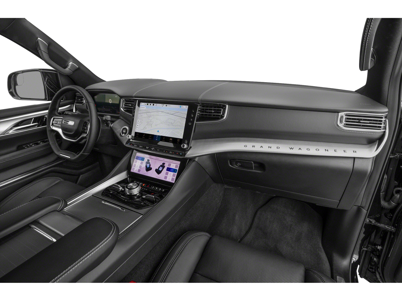Features Include:, Grand Wagoneer L Series III, 4D Sport Utility, 3.0L I6, 8-Speed Automatic, 4WD, Bright White Clearcoat, Global Black Leather, 3.92 Rear Axle Ratio, Adjustable pedals, Apple CarPlay/Android Auto, Auto-leveling suspension, Brake assist, Electronic Stability Control, Four wheel independent suspension, Front dual zone A/C, Front fog lights, Fully automatic headlights, Garage door transmitter, Heads-Up Display, Heated door mirrors, Heated front seats, Heated rear seats, Heated steering wheel, Illuminated entry, Memory seat, Navigation System, Night vision lights, Occupant sensing airbag, Pedal memory, Power adjustable front head restraints, Power driver seat, Power Liftgate, Power moonroof, Power passenger seat, Premium Leather Trimmed Bucket Seats, Quick Order Package 28W, Radio: Uconnect 5 Nav w/12.0 Display, Rear dual zone A/C, Rear window defroster, Reclining 3rd row seat, Remote keyless entry, Speed-Sensitive Wipers, Steering wheel mounted audio controls, Telescoping steering wheel, Traction control, Two Tone Paint Group, Variably intermittent wipers, Ventilated front seats, Ventilated rear seats, Wheels: 22 x 9.0 Premium 4 Aluminum.